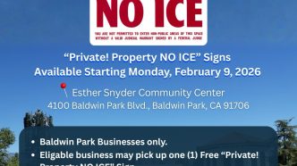 Baldwin Park business can now pick “Private! Property – NO ICE” signs at Esther Snyder Community Center, located at 4100 Baldwin Park Blvd., from Monday to Thursday from 8 a.m. to 8 p.m. or on…