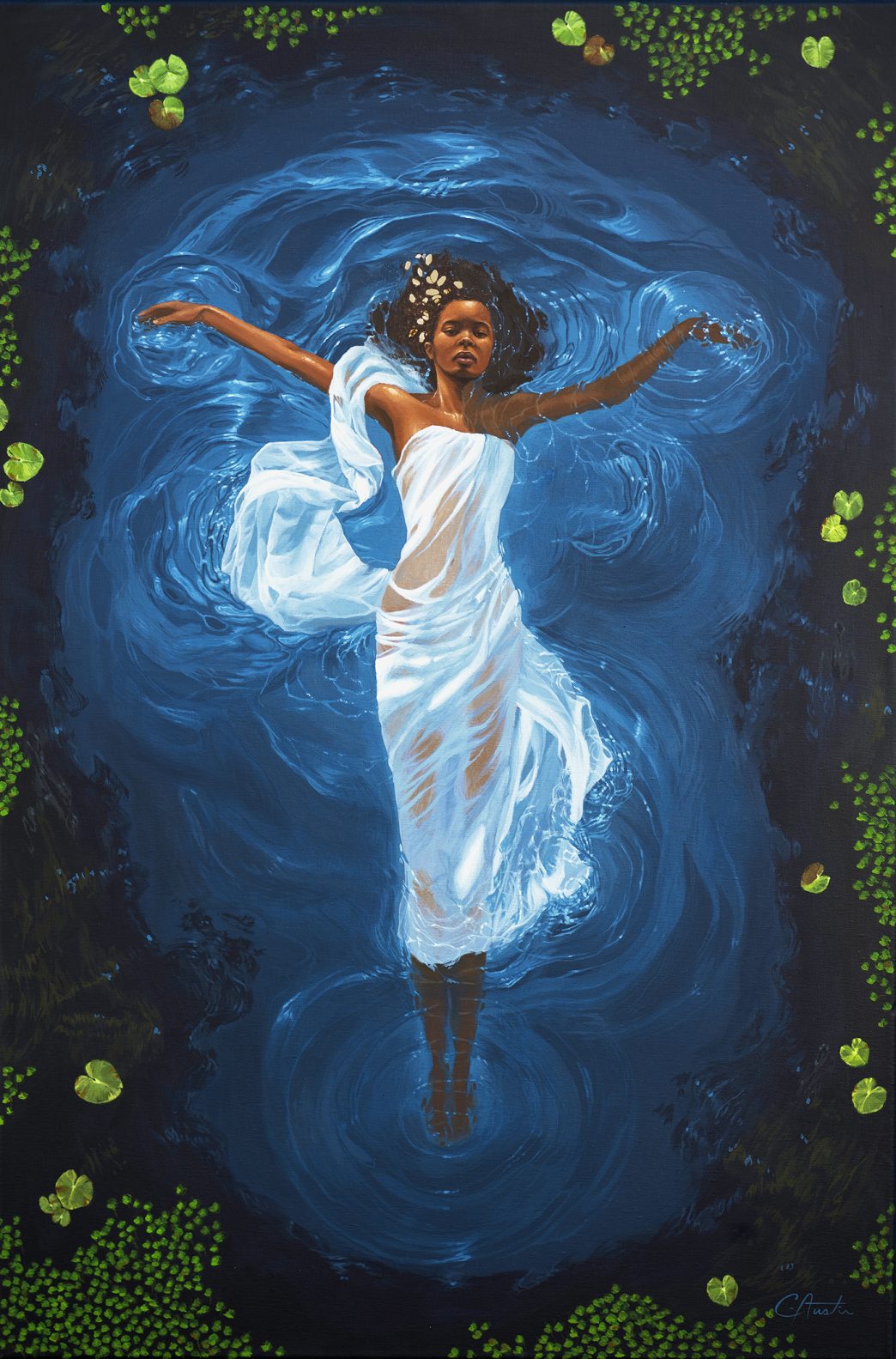 Among the first-time artists is Christen Austin, whose painting “Living Water” merges figurative and portrait narratives to explore Black culture in America. Austin celebrates the beauty and resilience of Black identity through a surrealistic lens, affirming its rightful place in all spaces. Another first-time artist, Ahrong Ferreira, presents a powerful watercolor and pencil work of art entitled “The Night in November” that evokes deep emotions tied to memory. Ferreira’s work draws from nature, inviting viewers to connect with her personal reflections on the world around her.
