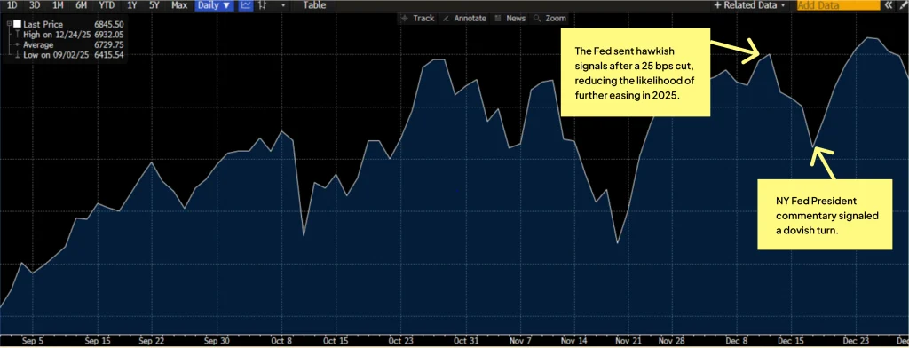 Markets should benefit from an easing liquidity headwind as quantitative tightening by the Fed has ended. A less restrictive liquidity backdrop typically lowers the “hurdle rate” investors apply to future cash flows and reduces the extra return they demand to own equities. That doesn’t guarantee higher P/E multiples, but it does raise the floor under valuations — making it easier for stock prices to hold through normal growth or inflation noise.