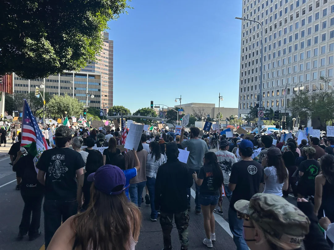 By the 1 p.m. start of the rally outside LA City Hall and at the adjacent Grand Park, a crowd of more than 1,000 protesters had assembled in the park, with the throng continuing to swell as demonstrators set off on a peaceful march eastward. Many crossed the Cesar E. Chavez Avenue bridge toward Boyle Heights.