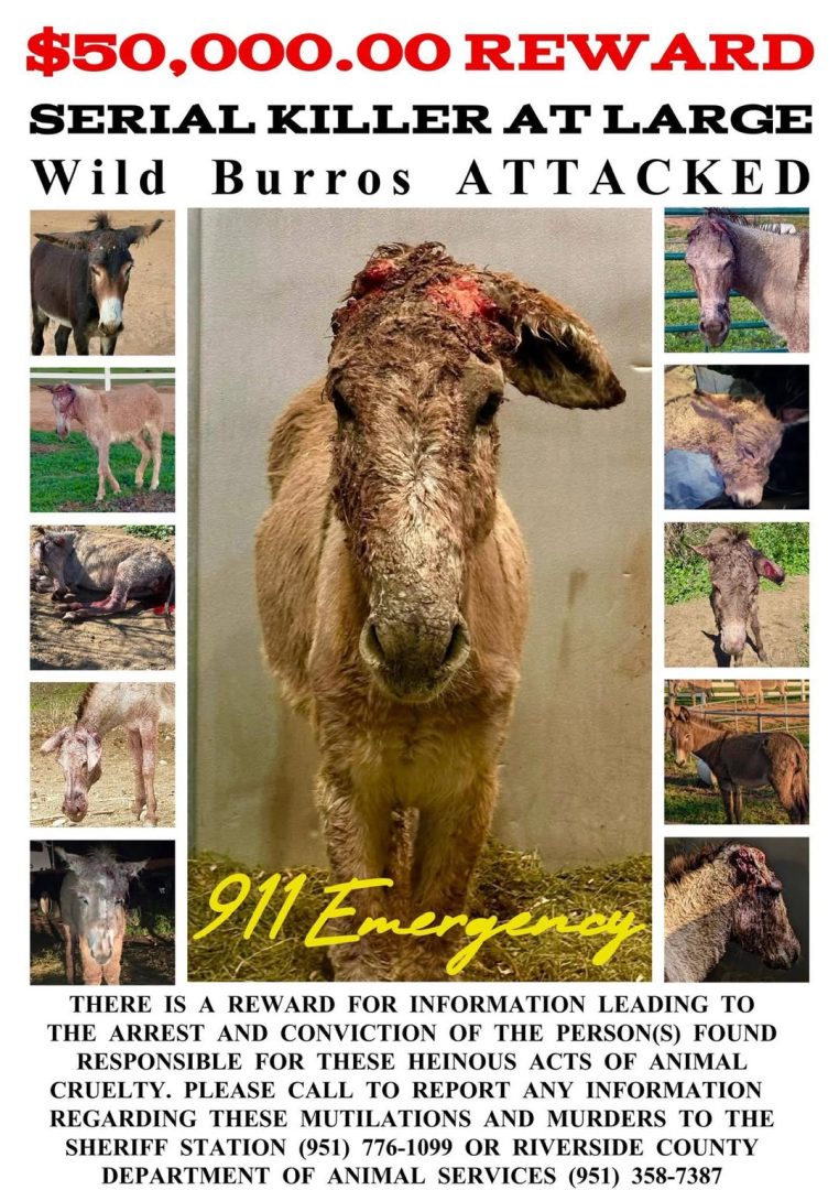 Anyone with information on donkey attacks was urged to call the Department of Animal Services, 951-358-7387, or the Moreno Valley Sheriff’s Station, 951-776-1099.